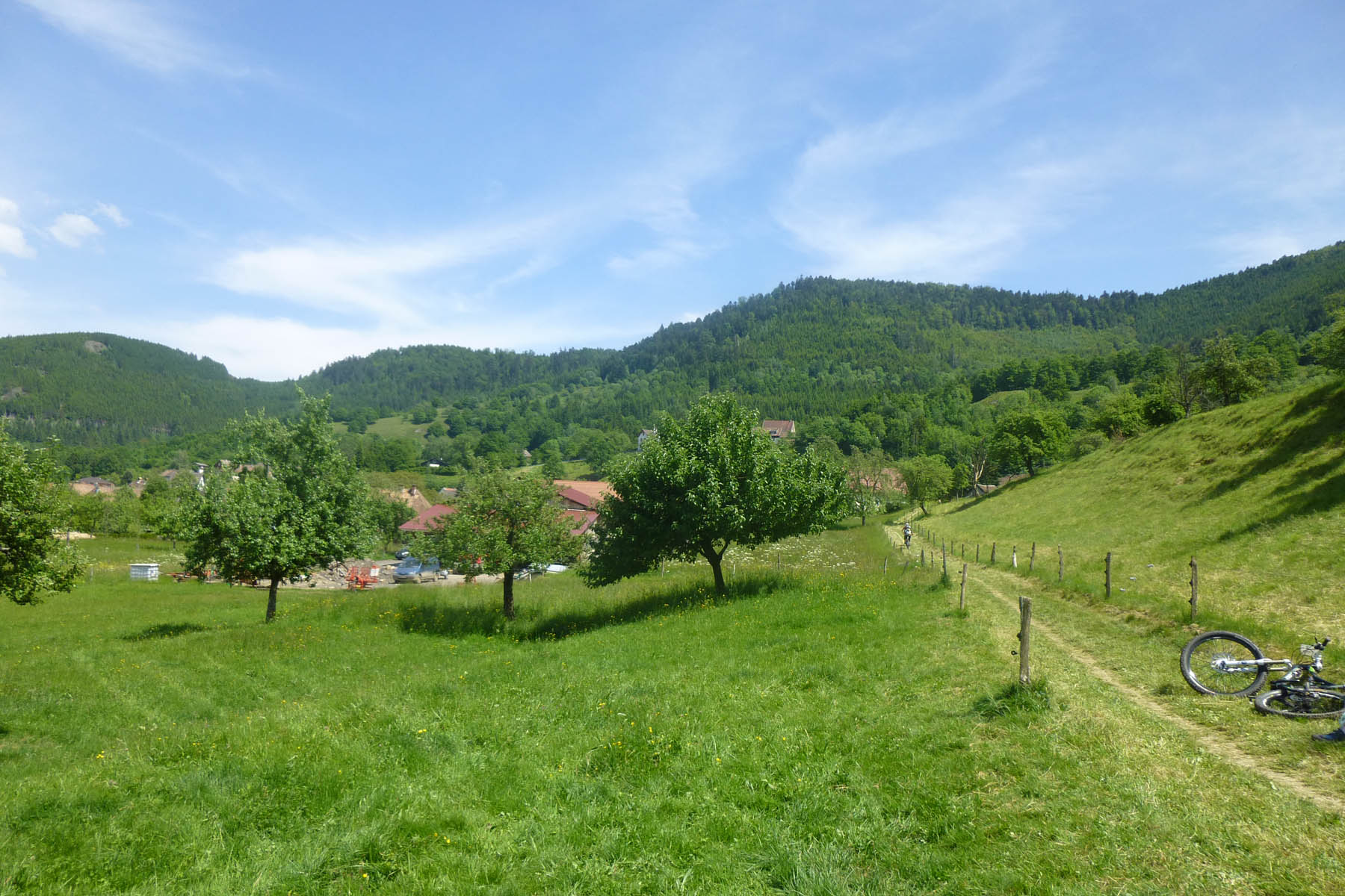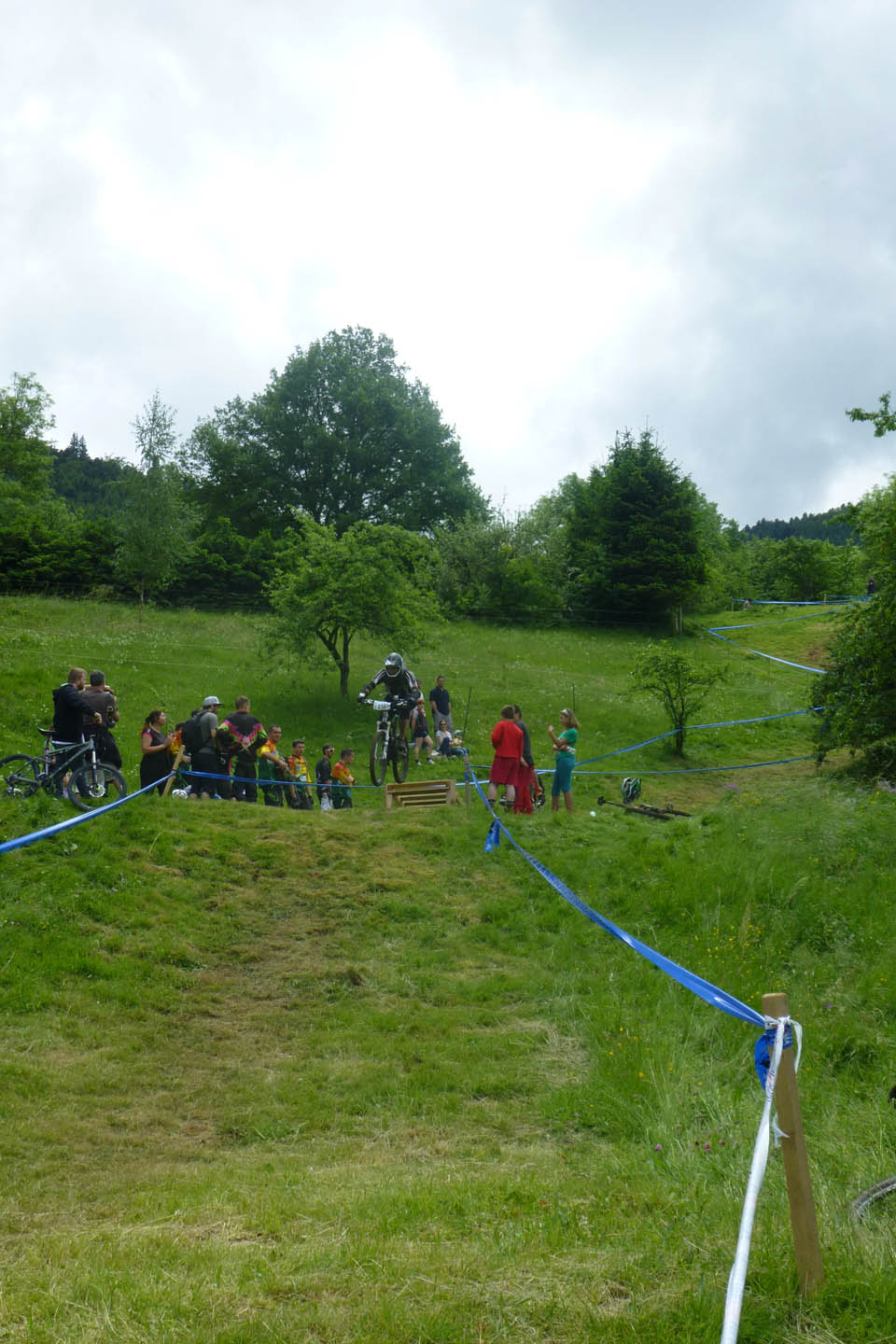 Stage four was shorter through off-camber grassy meadows, a short rocky forest section with a token gesture of mud and finishing by flying through the local vegetable gardens amid lots of shouting and cowbells to finish in the village centre where beer, roast pig and a live band awaited. I finished fourth on the day but with only 8 seconds off 3rd so the race was on!
