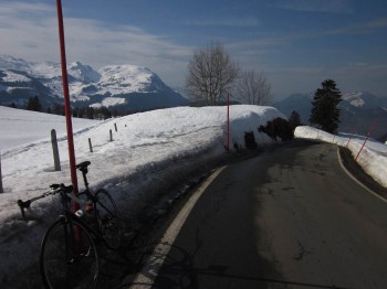 The weather has gone nuts and we’ve had a 30C temperature increase in the last 3 weeks and it now feels like summer. I’ve been getting cabin fever stuck in Zurich and the small hills around it so with 17c, blue skies and sunshine yesterday it was time for an adventure. What a ride – jersey and shorts, an 11km Hors category climb passing ski slopes and snow shoe hikers, an insanely fast fun descent back down, frozen lakes and xc ski areas, smelly cow farms and finally Saturday shoppers posing in their Gucci sunglasses beside Lake Zurich. The photos say it all, more here